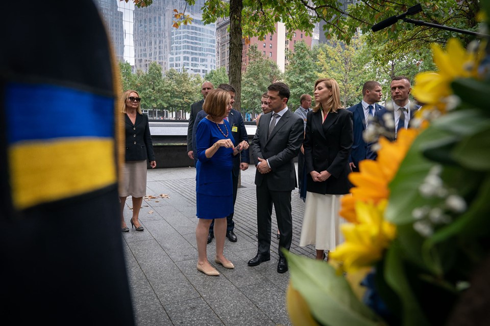 Глава держави поклав вінок до Меморіалу 9/11. Володимир та Олена Зеленські встановили на Меморіалі прапорець України, повідомляє Офіс Президента України.