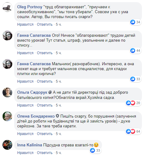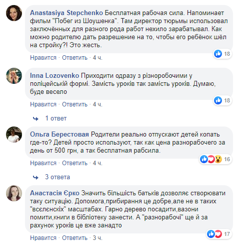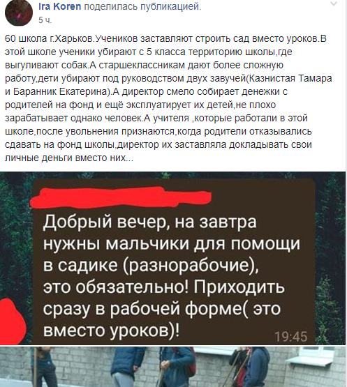 Об инциденте в Facebook-группе "БАТЬКИ SOS" сообщила мама школьника Ирина Корень, который ранее учился в этом заведении. Так, родителям учеников поступило сообщение, чтобы дети обязательно пришли вместо уроков в рабочей форме строить детсад.