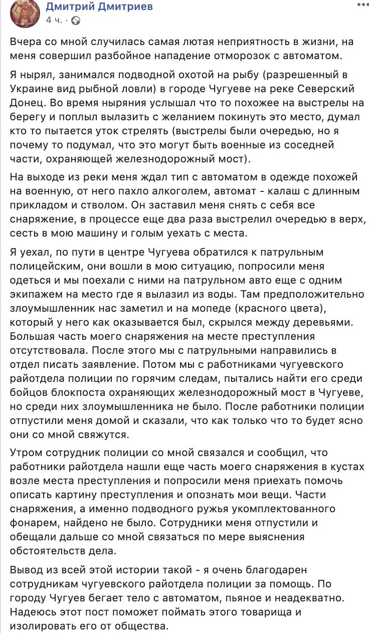 "Вывод из всей этой истории такой - я очень благодарен сотрудникам Чугуевского райотдела полиции за помощь. По городу Чугуев бегает тело с автоматом, пьяное и неадекватное. Надеюсь этот пост поможет поймать этого товарища и изолировать его от общества", - описал произошедшее с ним в Facebook Дмитрий Дмитриев.