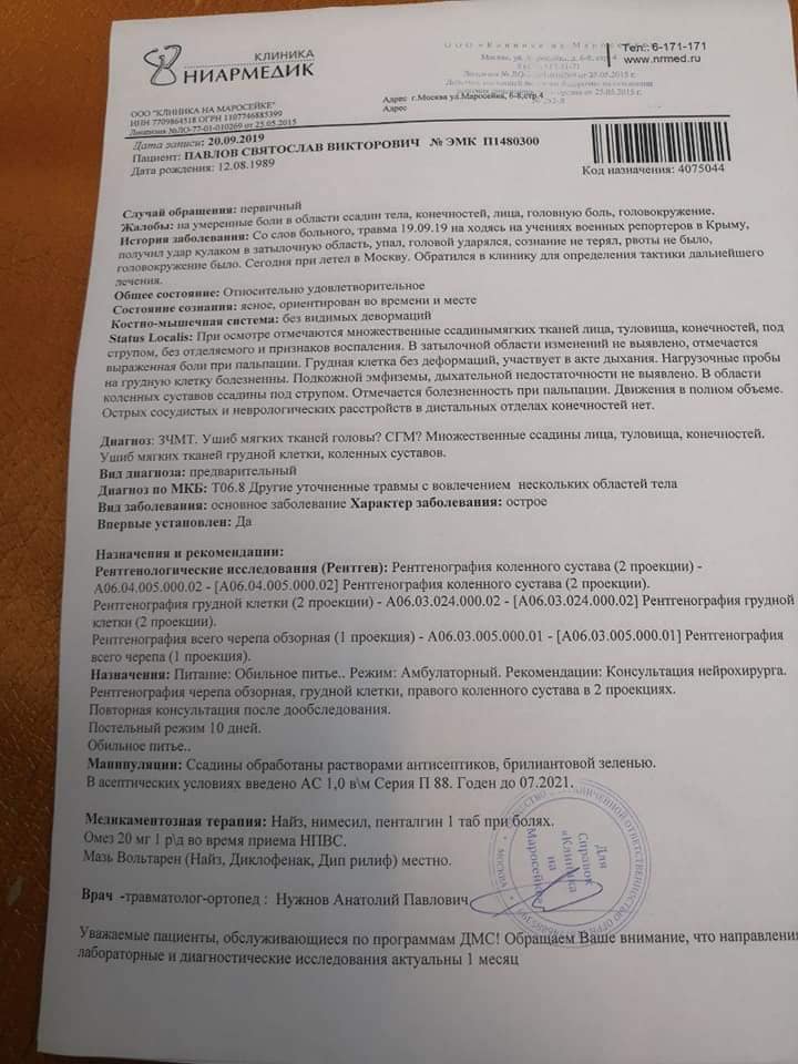После возвращения в Москву я сразу обратился к врачам, которые и зафиксировали все мои многочисленные травмы. Мне и до сих пор хуево, болит башка и постоянно хочется спать. Я попытался решить вопрос со своим руководством, но услышан не был. По мнению начальства, такие травмы "можно получить и на хоккее". Что ж, интересно было бы посмотреть на хоккей с мешками на голове. "Ты просто не готов к горячим точкам (к пиздюлям?)", - заявил мне руководитель. Причем самое смешное, что буквально этой весной, когда меня отправляли в Сирию, к горячим точкам я был вполне готов и пригоден. Сейчас я не вижу никаких других выходов, кроме как сделать историю публичной, а справедливости добиваться уже в судебном порядке. Организаторы курсов должны понести заслуженное наказание, а учебную программу "Бастиона" нужно радикально пересмотреть. Курсы военных журналистов должны обучать людей, а не травмировать и калечить. Поехавшие маразматики и откровенные психи с чечено-стокгольмскими синдромами из года в год устраивают свою Республику Сало, с которой нужно немедленно покончить, пока никто из журналистов не умер и не стал инвалидом.