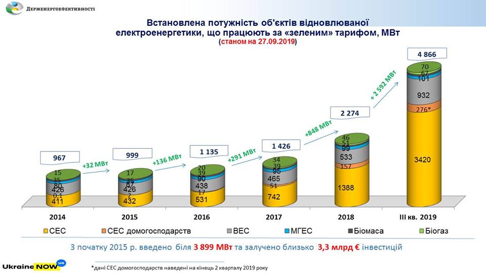 Общая мощность производителей из возобновляемых источников энергии (ВИЭ), которые работают по "зеленому" тарифу, на начало октября этого года составляла около 5000 МВт, что в 2,77 раза больше показателя на начало октября прошлого года