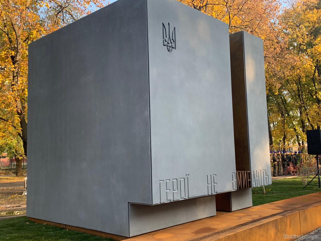 Центральный элемент памятника – куб, символизирующий целостность и силу государства. Специально выполненный из проржавевшей стали, монумент символизирует весь трагизм и сложность происходящих в стране событий. Каждый может это увидеть и найдет в этом месте свой скрытый смысл. Помимо монумента здесь установлено четырнадцать стел – в память о тяжелом 2014-м. На колоннах нет имен тех погибших, вместо них — строки из стихотворения Владимира Сосюры «Любіть Україну».
