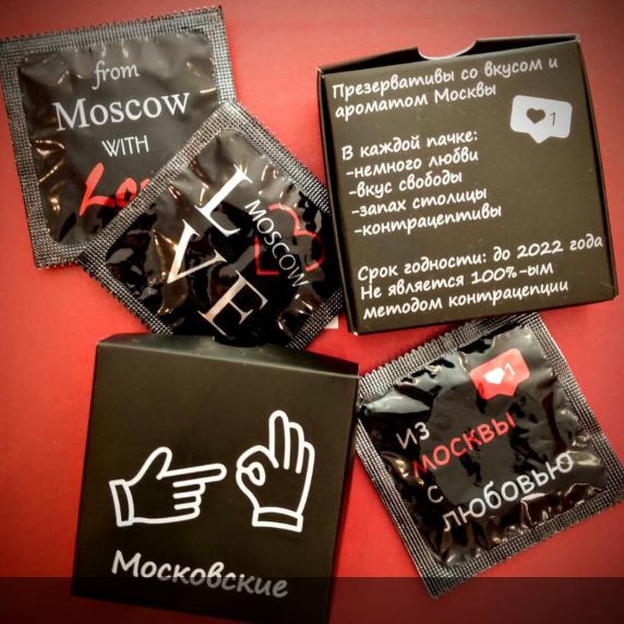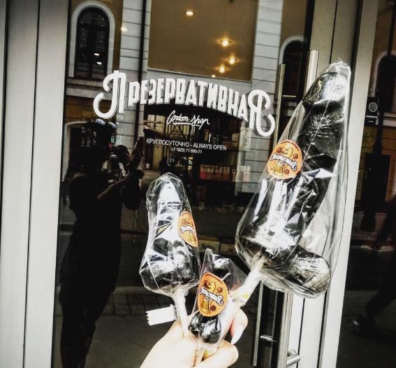 В ассортименте не только презервативы, но и леденцы в виде мужских половых членов или невинных розочек, а так же презервативы "со вкусом Москвы".