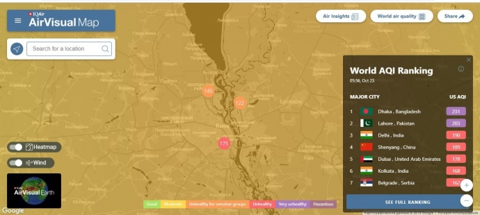 Возглавляют рейтинг самых загрязненных городов Дакка (Бангладеш) с показателем в 231 единицу, Лахор (Пакистан) – 203 и Дели (Индия) - 190.