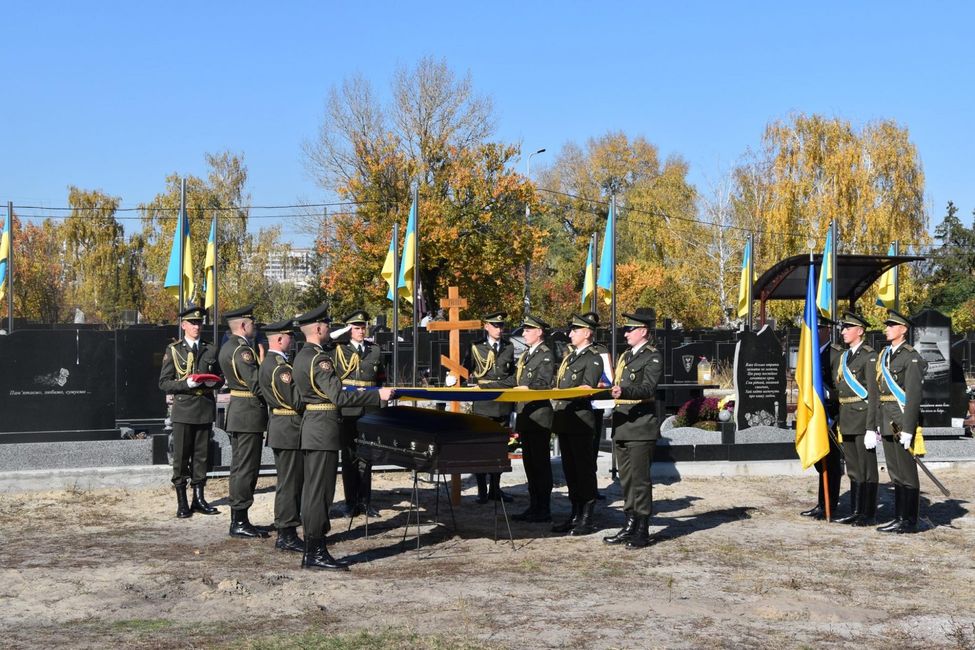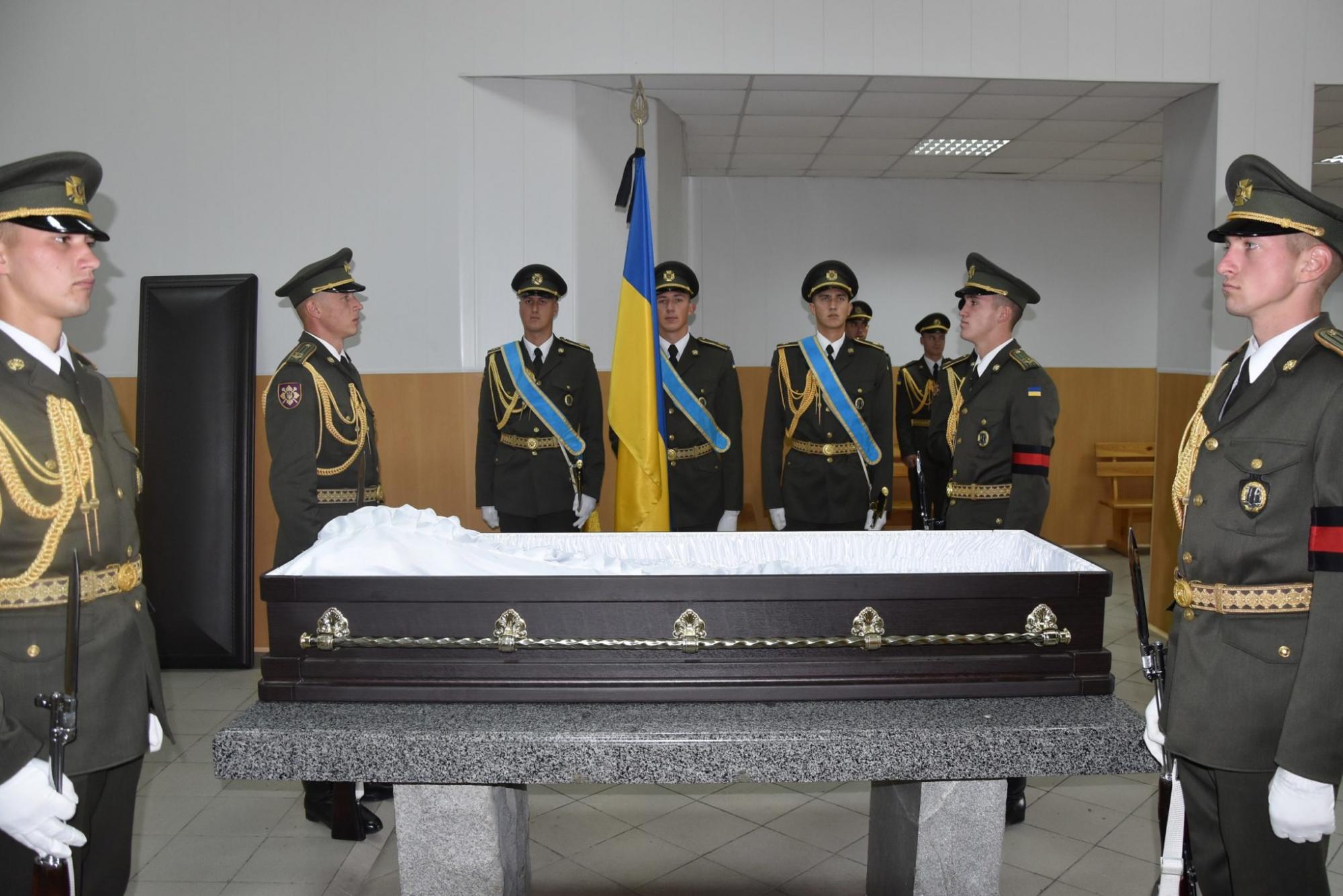 Пустой гроб, за которым идет капеллан, почетный караул, флаг Украины, салютные выстрелы...