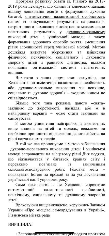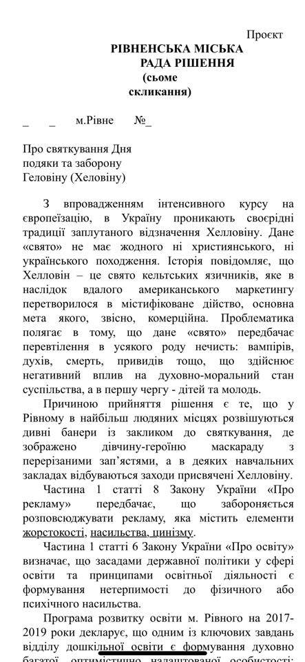 Так, в проекте решения отмечается, что праздник Хэллоуина "не имеет никакого ни христианского, ни украинского происхождения".