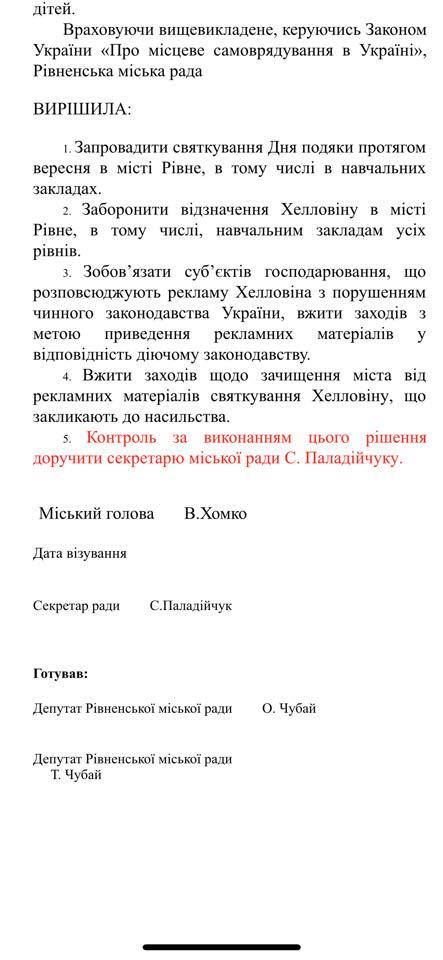 "Вместе с Татьяной Чубай инициировали проект решения о праздновании Дня благодарения и запрет Хэллоуина (Хэллоуина) в Ровенском городском совете. Поддерживают мэр и многие депутаты, которые болеют за мораль общества, в т.ч. молодежи! Но впереди голосование ...", - написал Чубай.