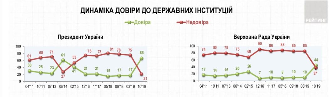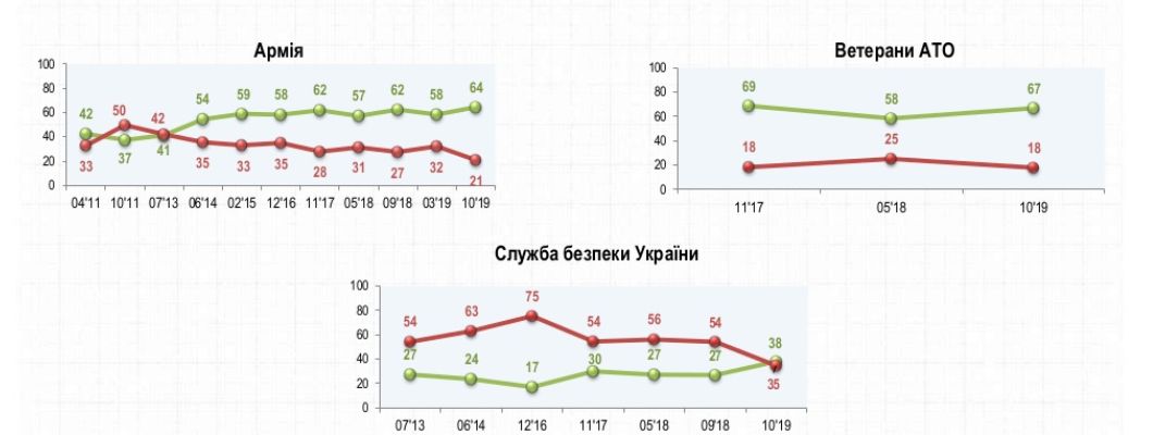 Впервые за последние несколько лет социологи фиксируют превышение рейтинга доверия украинцев Президенту в сравнении с рейтингом доверия армии. Об этом свидетельствуют результаты опроса, проведенного Социологической группой «Рейтинг» в течение 19-22 октября 2019 года. Больше всего сегодня доверяют волонтерам (69%), ветеранам АТО (67%), Президенту Украины (66%), армии - 65%.