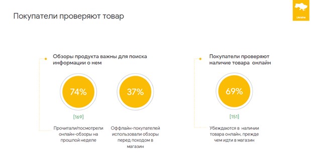 Также, согласно данному исследованию, изучение обзоров продуктов перед покупкой является важным моментом для украинцев. Так, 74% респондентов читают или смотрят обзоры интересующей продукции, а 37% оффлайн-покупателей использовали онлайн-обзоры перед походом в магазин. 69% покупателей проверяли онлайн наличие товара в магазине перед походом в магазин.