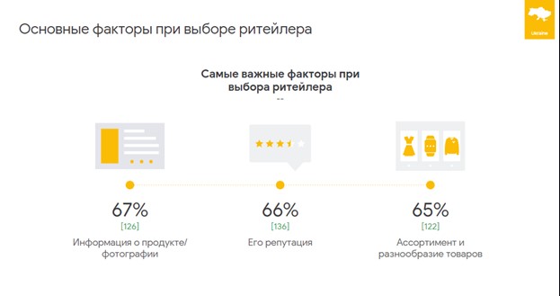 Что касается выбора магазина для совершения покупок, украинские покупатели учитывают три наиболее важных для них фактора: 67% – отмечают важность информации о продукте/фотографии, 66% – репутацию магазина и 65% – ассортимент и разнообразие товара.