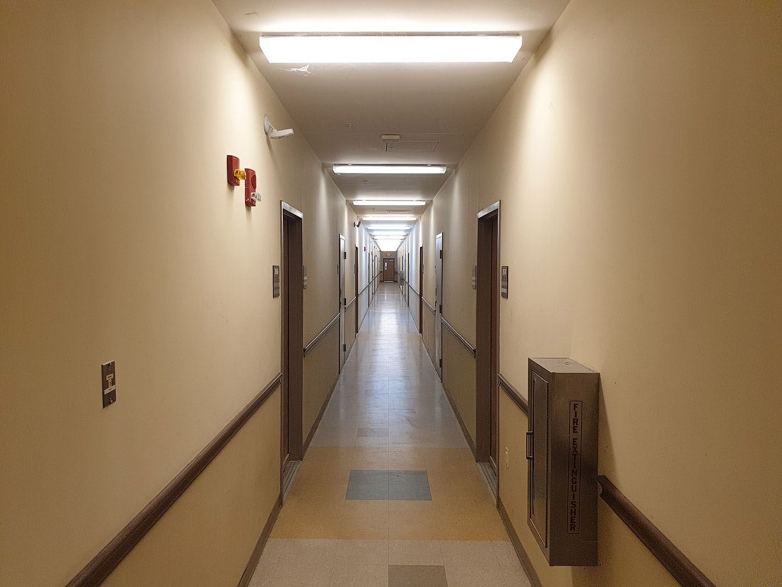 05. Коридоры внутри барака. За каждой такой дверью размещается нечто вроде небольшой квартиры для двух человек — в прихожей-холле есть общая кухня и санузел, а также две отдельные комнаты, в каждой из которых живёт по одному военнослужащему.
