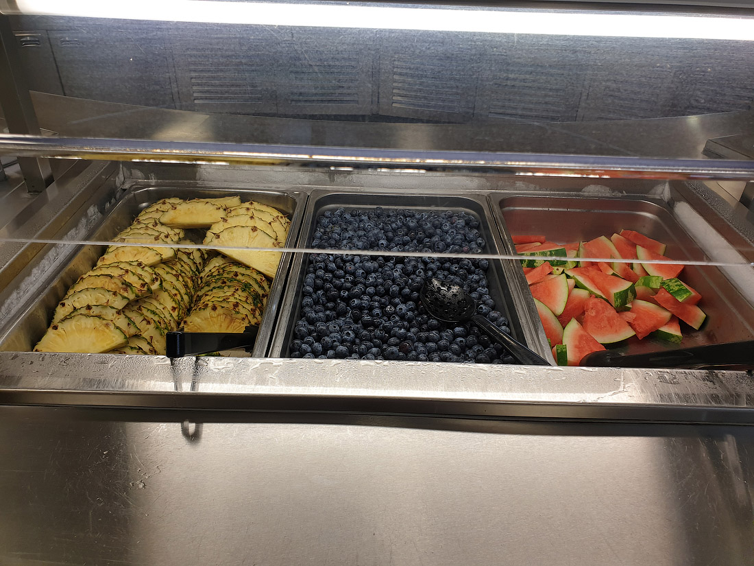 22. Пример завтрака — свежесваренная каша с йогуртом, чашка голубики, тарелка нарезанной дыни, сладости и кофе.