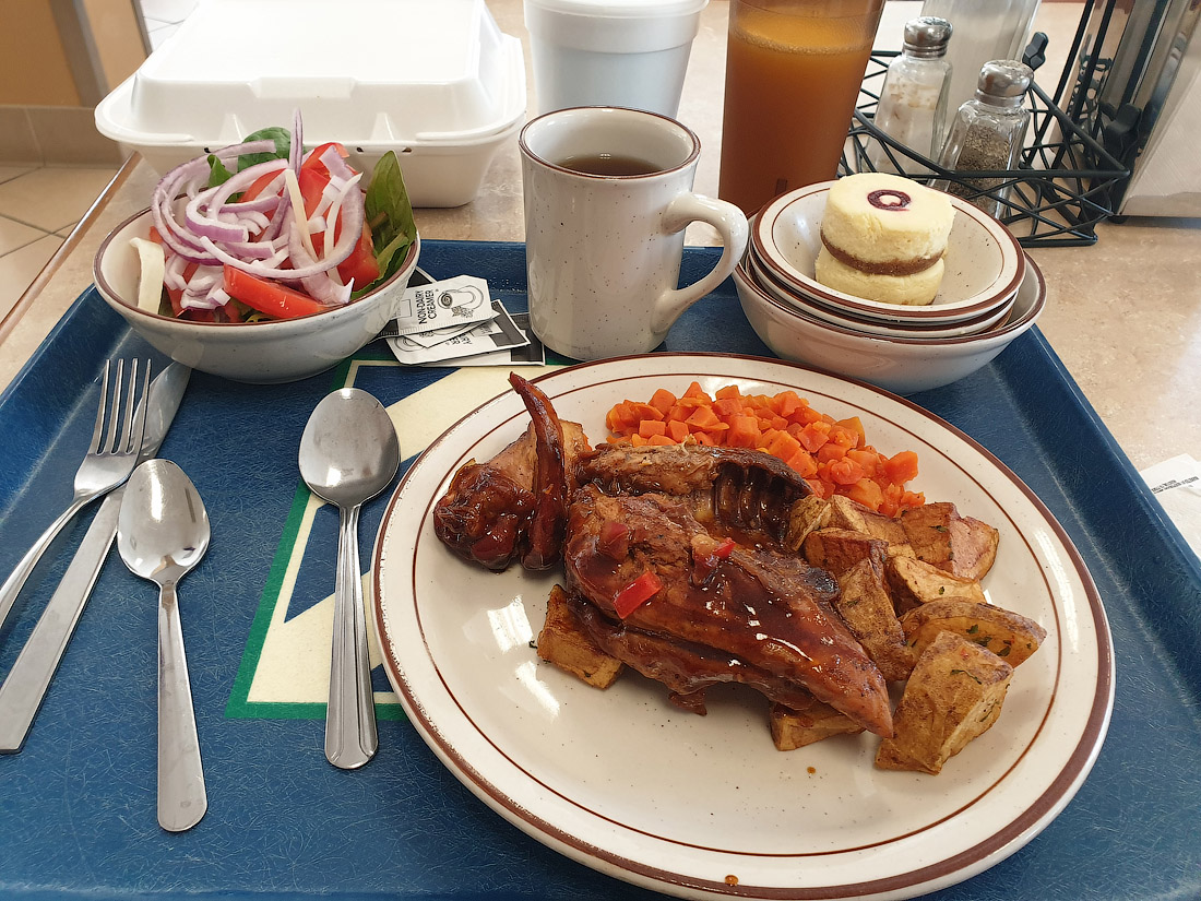 21. Ещё один обед — отлично приготовленное мясо, запечённый картофель, салат из свежих овощей, десерт. Как видно — всё отлично сбалансировано по белкам/жирам/углеводам.