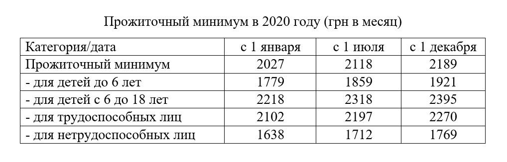 Прожиточный минимум в том варианте госбюджета, за который голосовали 14 ноября народные депутаты, по сравнению с первоначальным вариантом, не увеличился ни на гривню. С 1 января он будет составлять 2027 грн в месяц. Точнее, до такого уровня прожиточный минимум поднимется с 1 декабря 2019 года и продержится до конца июня 2020 года. С 1 июля он увеличится до 2118 грн, а с 1 декабря – до 2189 грн. Таким образом, за год прожиточный минимум вырастет на 162 грн, или на 8%. Если учесть, что, по расчетам, инфляция за 2020 год должна составить около 5-5,5% (по разным расчетам), получится, что благосостояние людей, имеющих доходы в размере официального прожиточного минимума, улучшится на 2-2,5%.