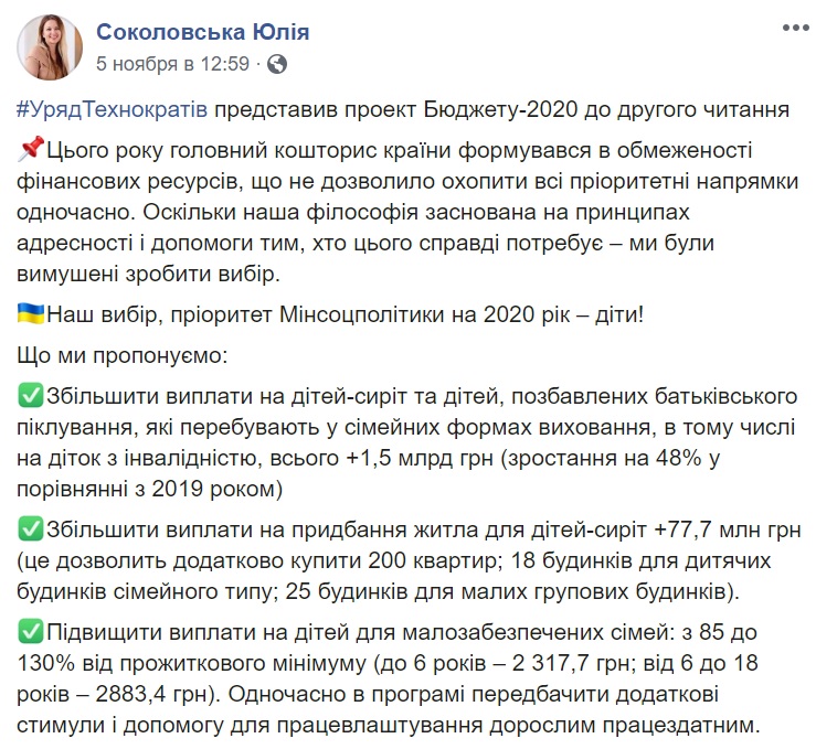 "В этом году главная смета страны формировалась в ограниченности финансовых ресурсов, что не позволило охватить все приоритетные направления одновременно. Поскольку наша философия основана на принципах адресности и помощи тем, кто в этом действительно нуждается, – мы были вынуждены сделать выбор. Наш выбор, приоритет Минсоцполитики на 2020 год – дети", – написала в Facebook министр соцполитики Юлия Соколовская.