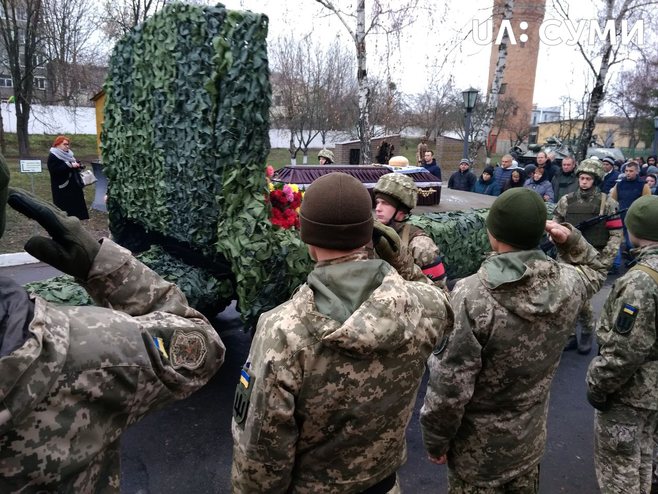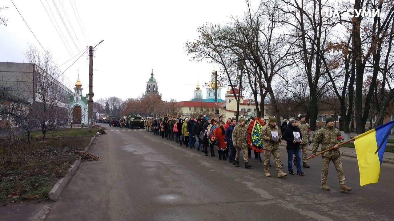 Жители города Ахтырка Сумской области провожают в последний путь военнослужащих Дмитрия Мовчана и Дениса Ярмака, которые получили смертельные ранения во время взрывов на арсенале в Балаклее 15 ноября.