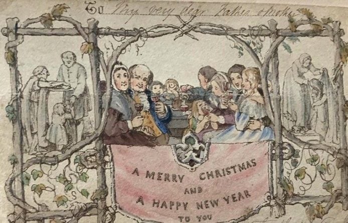 Открытку отпечатали в 1843 году, когда один из авторов викторианской эпохи опубликовал «Рождественскую колядку», историю об Эбенезере Скрудже, воспрянул духом после посещения духами Рождества прошлого, настоящего и будущего.