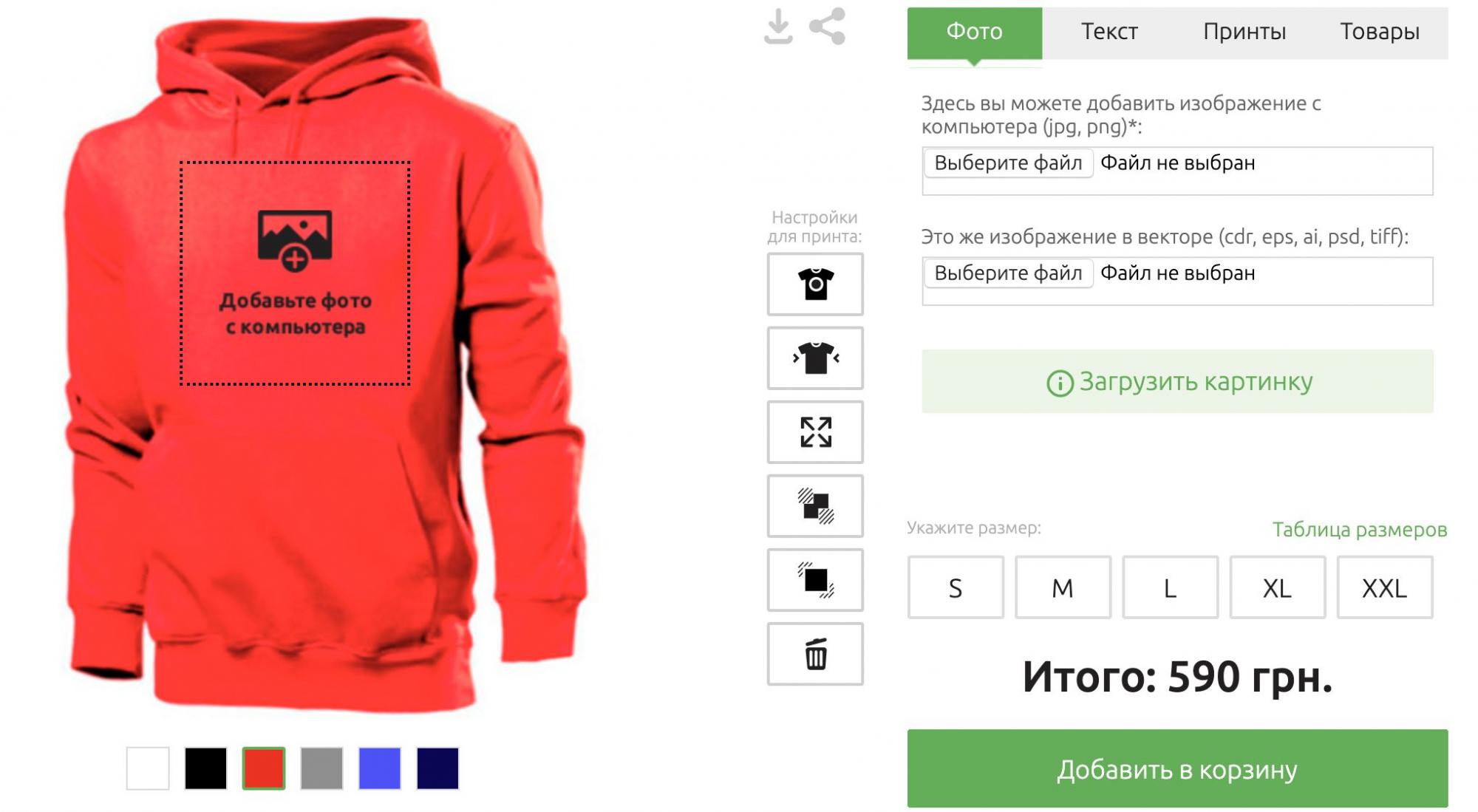 - загружаете свое изображение (подходит jpg или png) / или пишете свой текст, который потом отобразится на толстовке / или выбираете принт из предложенного FatLine;