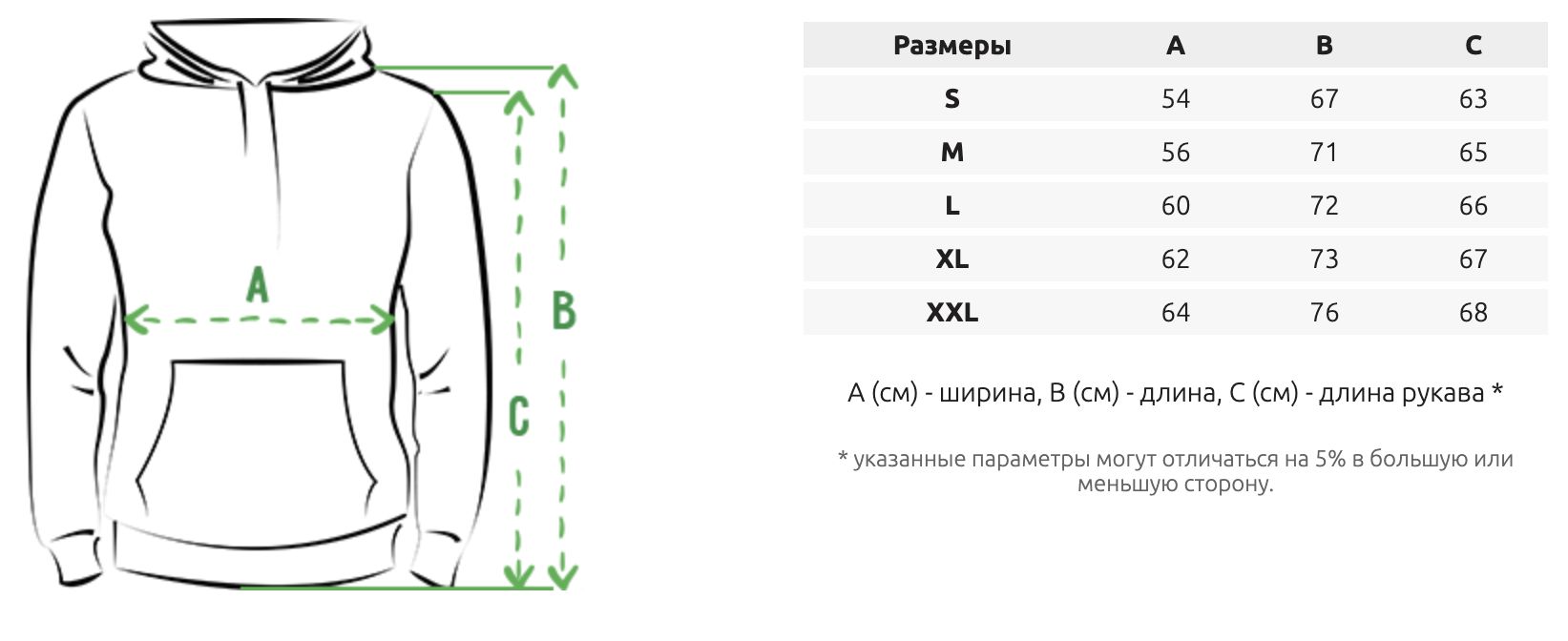 При выборе размера толстовки обратите внимание на все параметры и имейте в виду - они могут отличаться на 5% в большую или меньшую сторону.