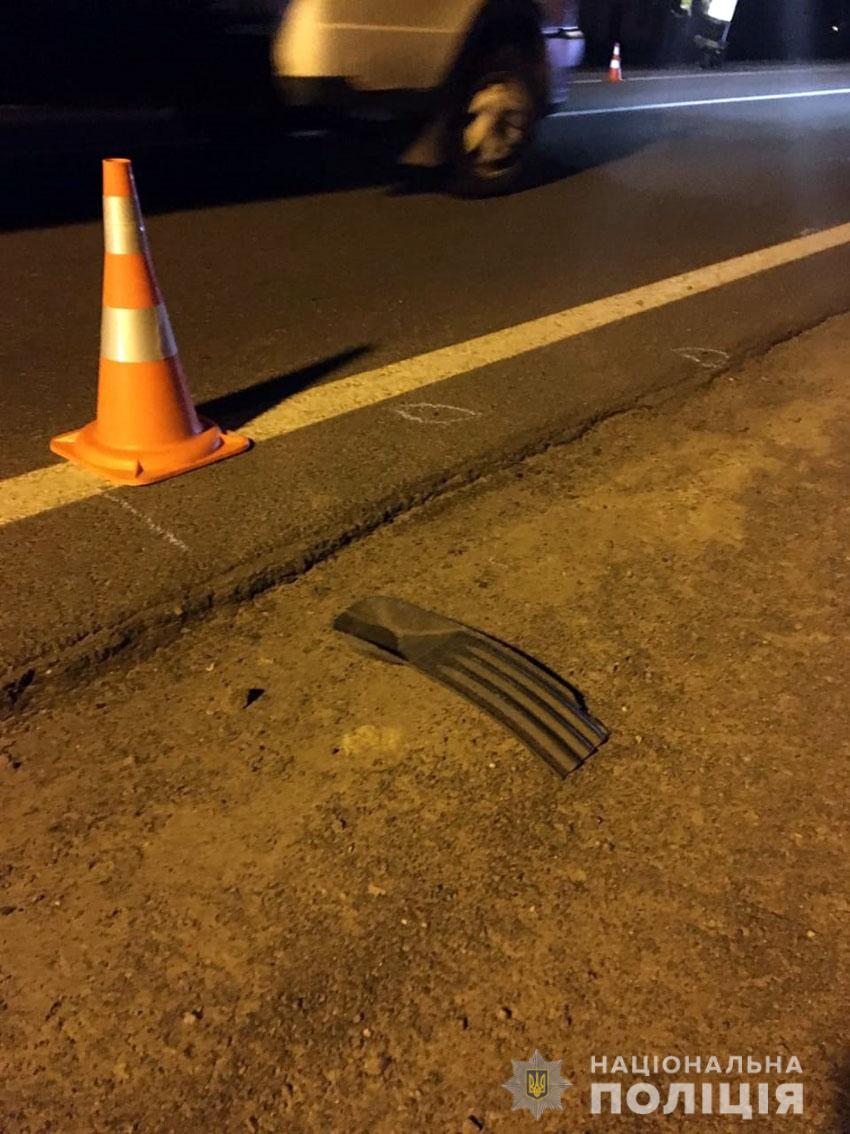 На місці дорожньо-транспортної пригоди поліція вилучила уламки дзеркала та переднього бамперу автомобіля «Фольцваген», зробила зліпки протектора шин.