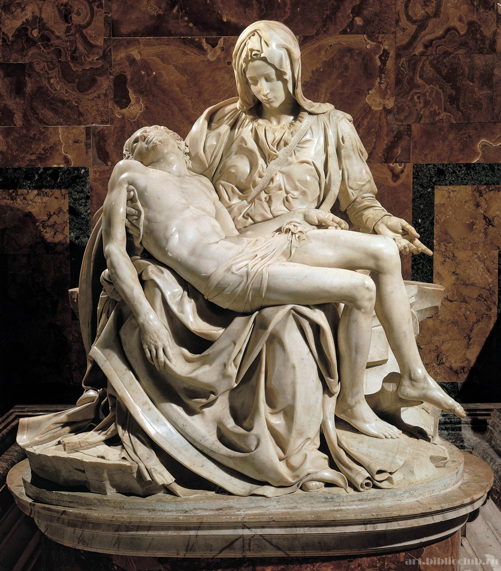 Созданная из огромного блока белого каррарского мрамора между 1547 и 1555 годами, когда Микеланджело был на пороге своего 80-летия, флорентийская Пьета - работа, отражающая опыт автора и душевные муки; в отличие от Ватиканской Пьеты и следующей за ней Ронданини во флорентийском "Оплакивании Христа" тело Спасителя поддерживает не только Мария, но и Магдалина и Никодим, в котором Буонарроти изображает самого себя.