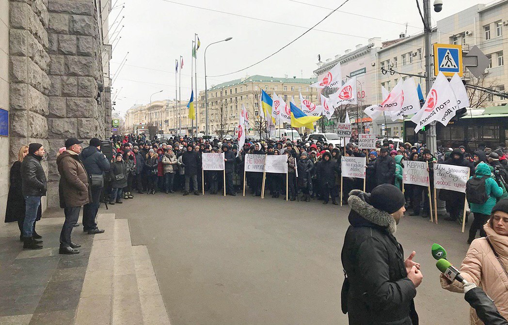 У здания горсовета проходит пикет предпринимателей рынка "Барабашова". Они протестуют против строительства дороги, в результате которого торговцы потеряют рабочие места.