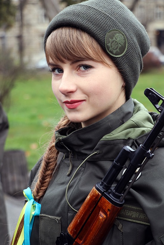 В строю стоит 19-летняя Марина Додчук. Здесь, на одной из львовских площадей молодая девушка сделала выбор своего будущего. Службу по контракту поедет проходить в Ровно, в часть НГУ 3055.