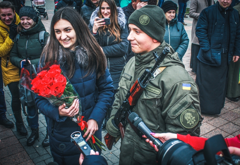 Ранее это было изюминкой для ритуала принятия присяги в Национальной гвардии Украины, а сейчас именно так молодые гвардейцы пытаются запомнить этот день и совместить две - едва ли не самые важные присяги своей жизни: народу и любимой. Как защитники семьи - большой украинской и маленькой - собственной, которую планируют создать.