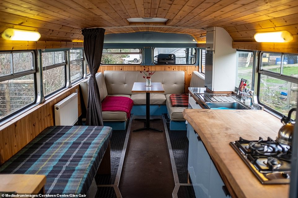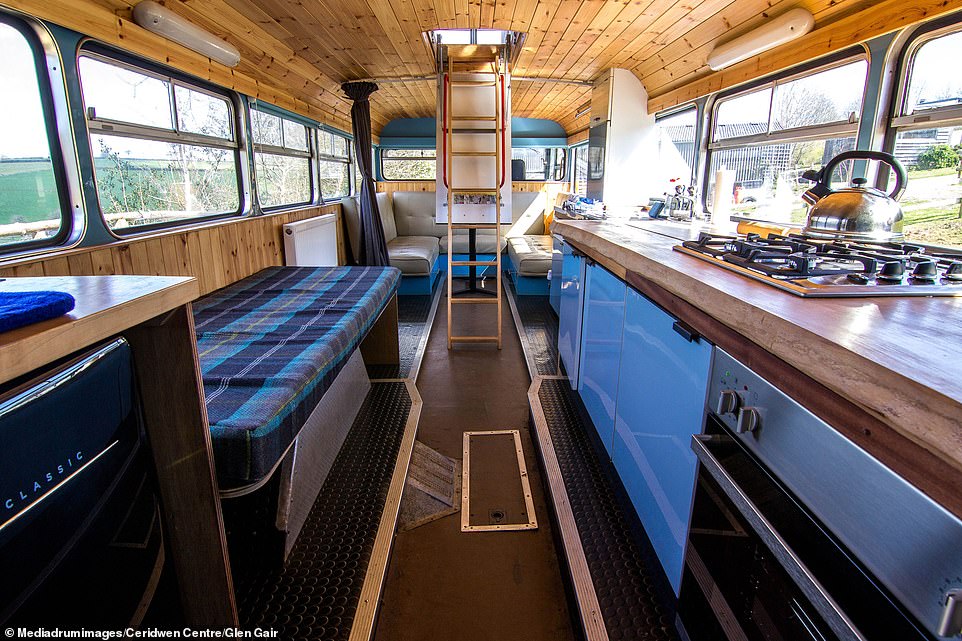 На первом этаже автобуса-отеля расположены гостиная и кухня с газовой плитой, духовкой, раковиной, набором всей необходимой посуды. На втором этаже — два отдельных номера. Подняться наверх туристы могут по узкой лестнице, такой же, как и во всех английских двухэтажных автобусах.