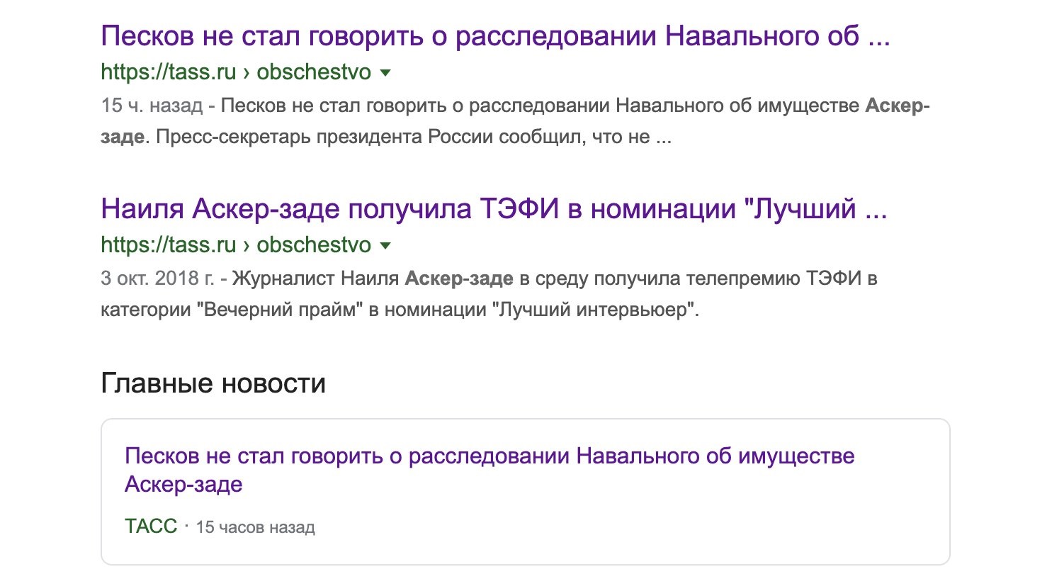 Агентства РИА Новости и ТАСС удалили свои новости, в которых упоминалось расследование Фонда борьбы с коррупцией об имуществе телеведущей Наили Аскер-заде. На это обратил внимание сотрудник отдела расследований ФБК Георгий Албуров.