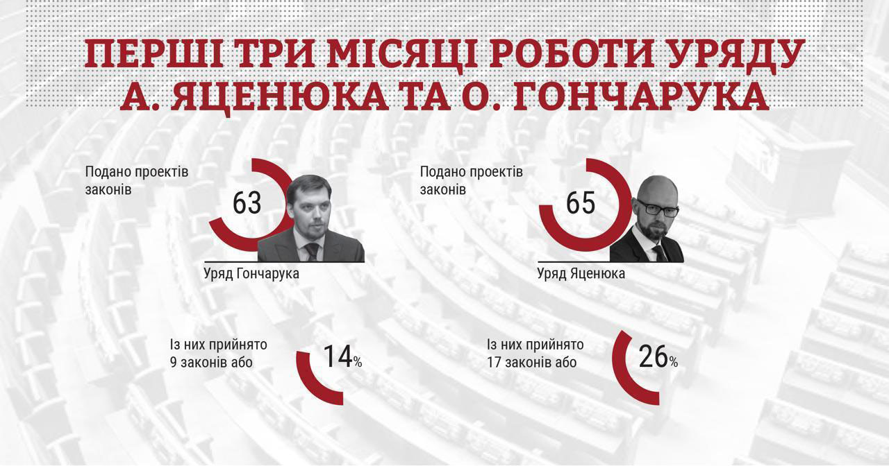 "Что касается деятельности Кабинета министров Украины, то во внимание были приняты показатель успешности законодательных предложений правительства. За первые три месяца работы у Алексея Гончарука этот показатель составил 14%, у Арсения Яценюка – 26%", – отмечают в КИУ.