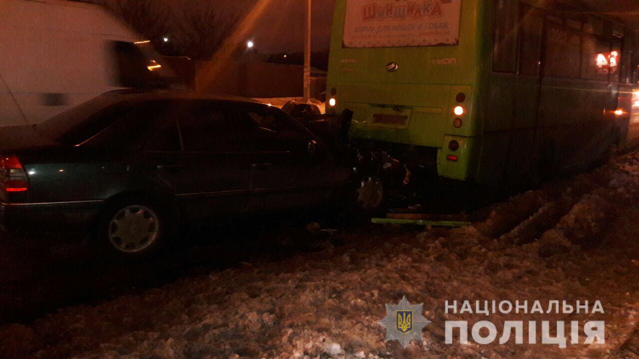 Водитель автомобиля "Mercedes" врезался в автобус "Ivan" который стоял на месте.