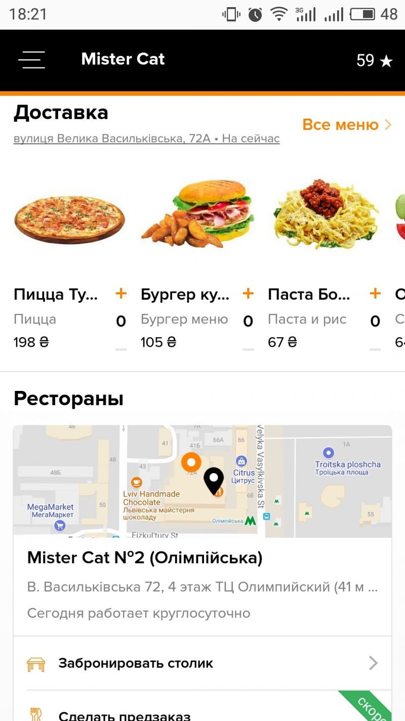 С помощью мобильного приложения Mister Cat можно не только сделать он-лайн заказ, но даже забронировать столик. Пользуйтесь!