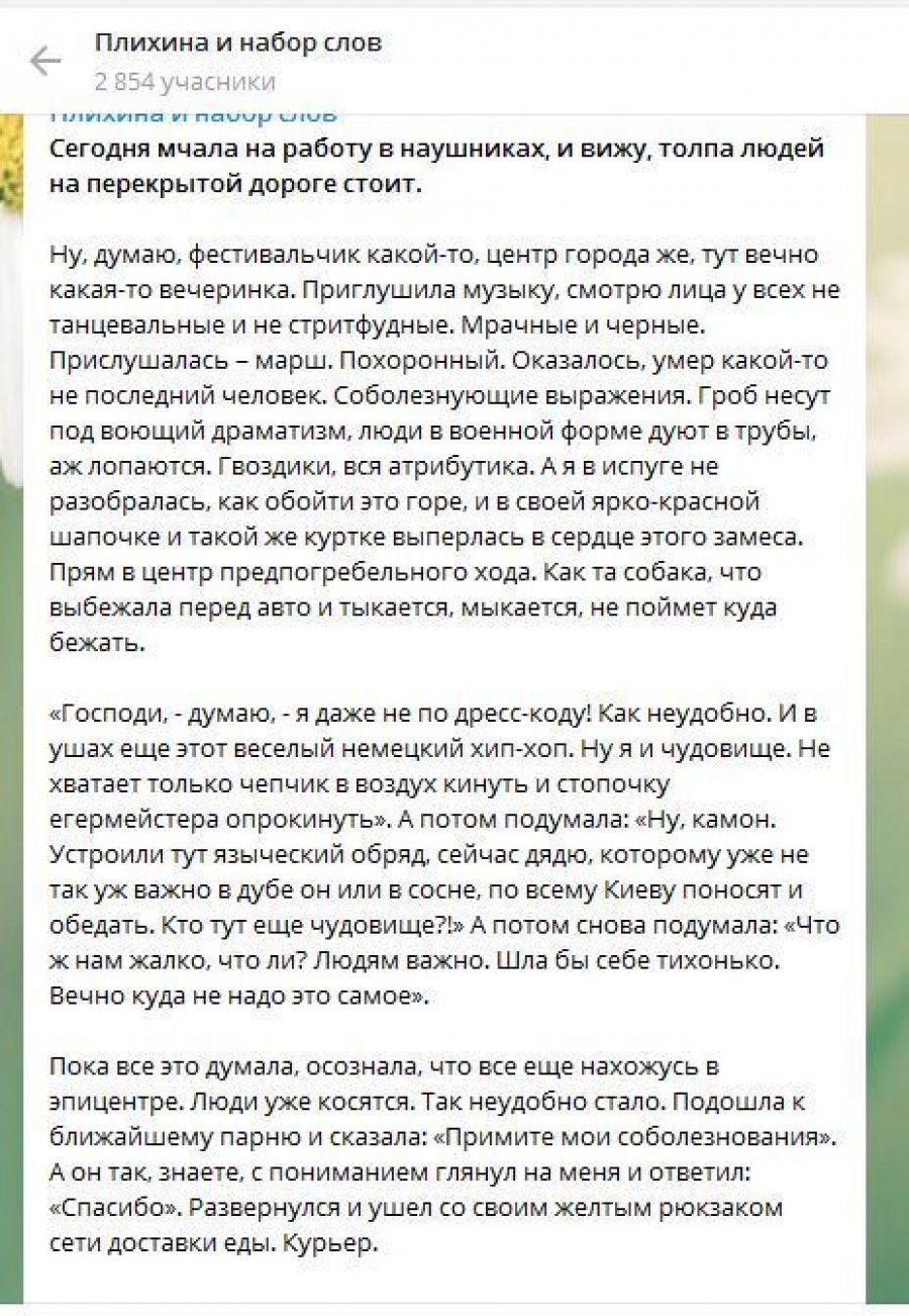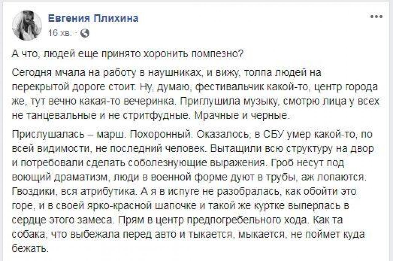В среду, 4 декабря, в центре Киева проходила церемония прощания с погибшим на Востоке полковником СБУ Денисом Волочаевым. Мимо шла замглавреда журнала Cosmopolitan Ukraine Евгения Плихина и написала пост об увиденном.