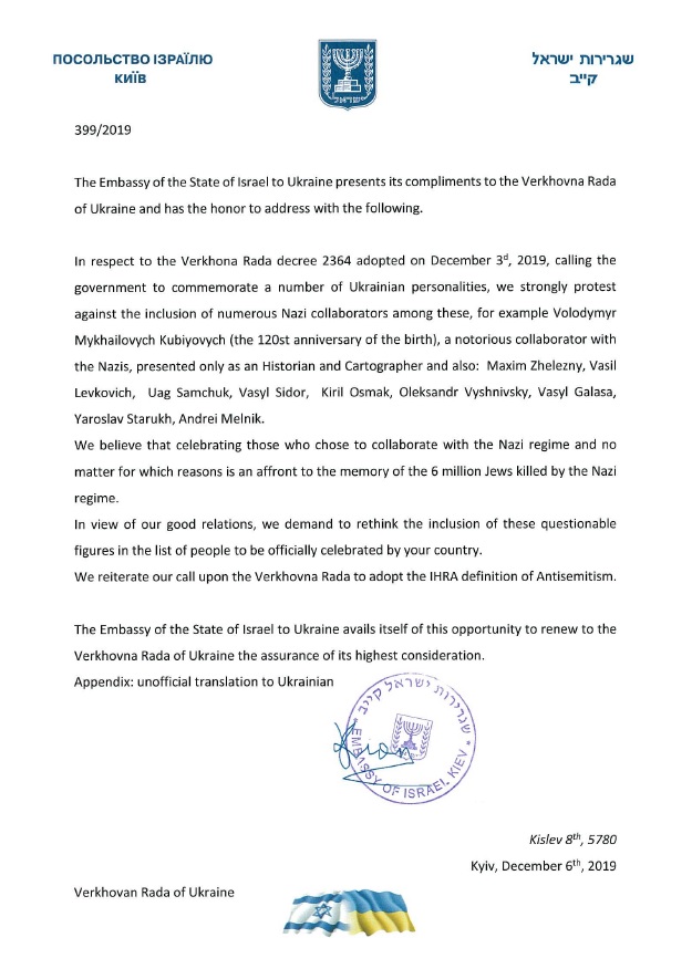 В частности, израильская сторона осудила принятие постановления Верховной рады от 3 декабря по чествованию ряда украинских деятелей.