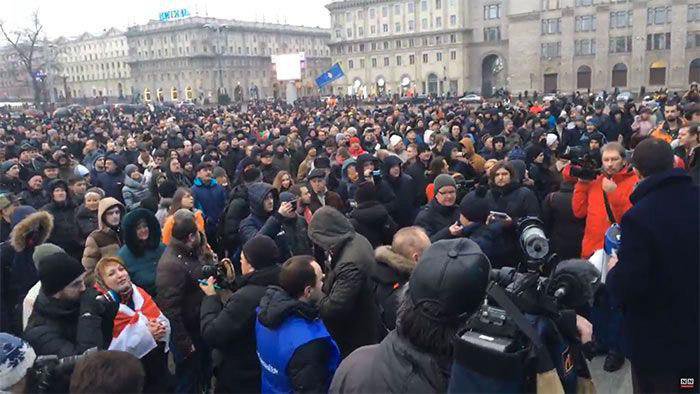 Милиция, по данным портала Tut.by, протестующих не задерживает, но предупреждает, что митинг незаконен, и предлагает разойтись. На фотографиях с митинга видны плакаты с лозунгами: "Нет русскому фашизму и бандитизму", "This is not integration - this is occupation" ("Это не интеграция - это оккупация").