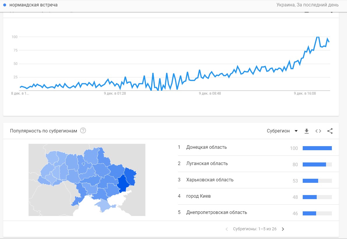 Встречей в нормандском формате активнее всего интересуются на востоке Украины 9 декабря 2019 18:14 За встречей в нормандском формате активнее всего следят в восточной Украине. Согласно данным Google Trends, новости из Парижа чаще всего ищут в в Донецкой, Луганской, Харьковской областях.