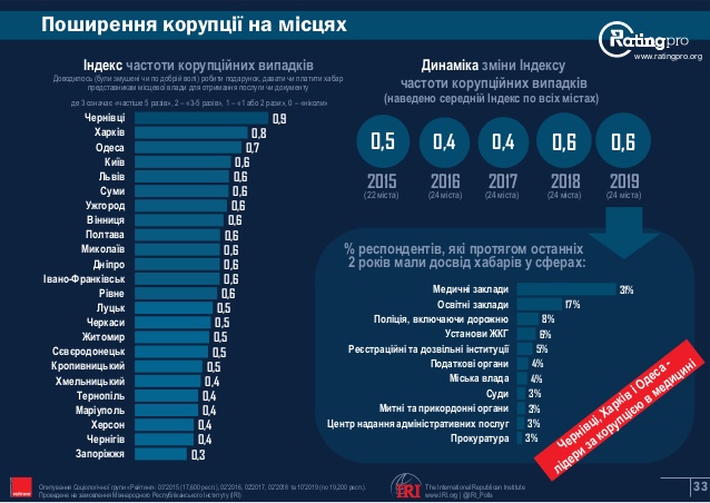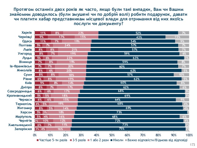 41% опрошенных социологами харьковчан признались, что за последние два года давали взятку. Такой же результат показал опрос в Черновцах, во всех остальных городах Украины уровень коррупции ниже. При этом 11% опрошенных признались, что давали взятку чаще 5 раз. Такой высокий показатель зафиксировали только в Одессе. 23% респондентов занимались взяточничеством 1-2 раза, 52% заявили, что за последние 2 года не давали взяток. 7% не смогли ответить на вопрос.
