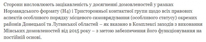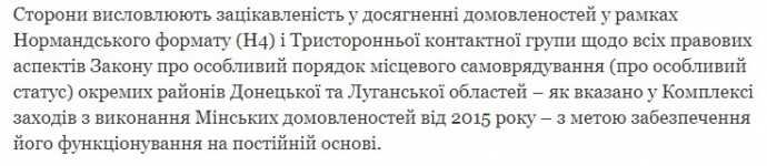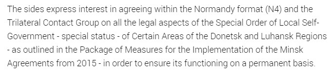 Было: "Стороны выражают заинтересованность в достижении договоренностей в рамках Нормандского формата (Н4) и Трехсторонней контактной группы по всем правовым аспектам Закона об особом порядке местного самоуправления (об особом статусе) отдельных районов Донецкой и Луганской областей – как указано в Комплексе мер по выполнению Минских договоренностей от 2015 года – с целью обеспечения его функционирования на постоянной основе".