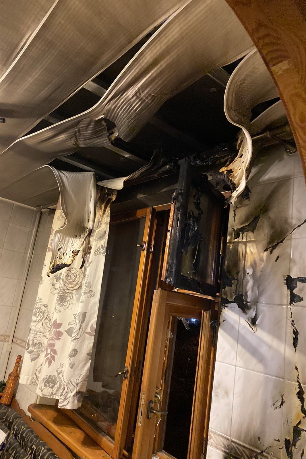 В результате горения огнем повреждены: штора, частично окно и пластиковая отделка потолка на площади около 3 кв.м.