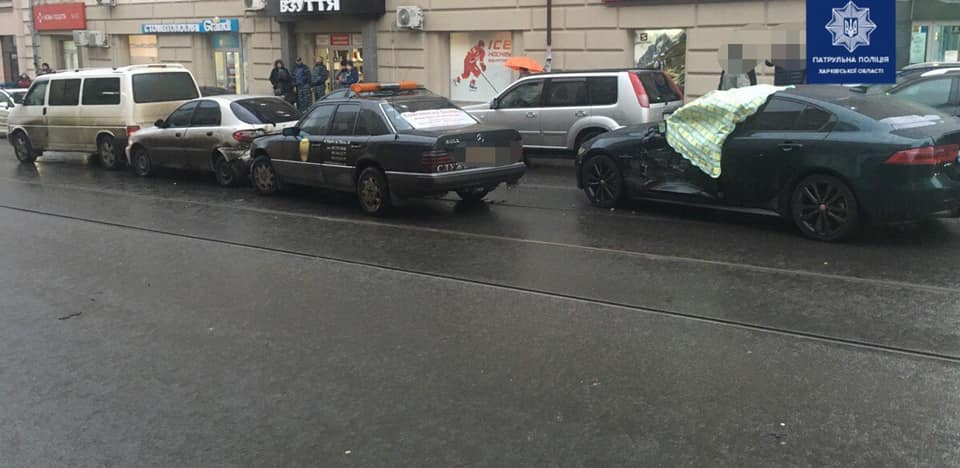По предварительной информации водитель автомобиля "Mercedes" нарушив правила дорожного движения, а именно п 11.9 и п.п. 12.1 ПДД Украины (выезд трамвайную линию встречного направления и нарушение скоростного режима), вследствие чего произошло столкновение автомобилей: "Toyota", "Daewoo", "Volkswagen" и "Jaguar".