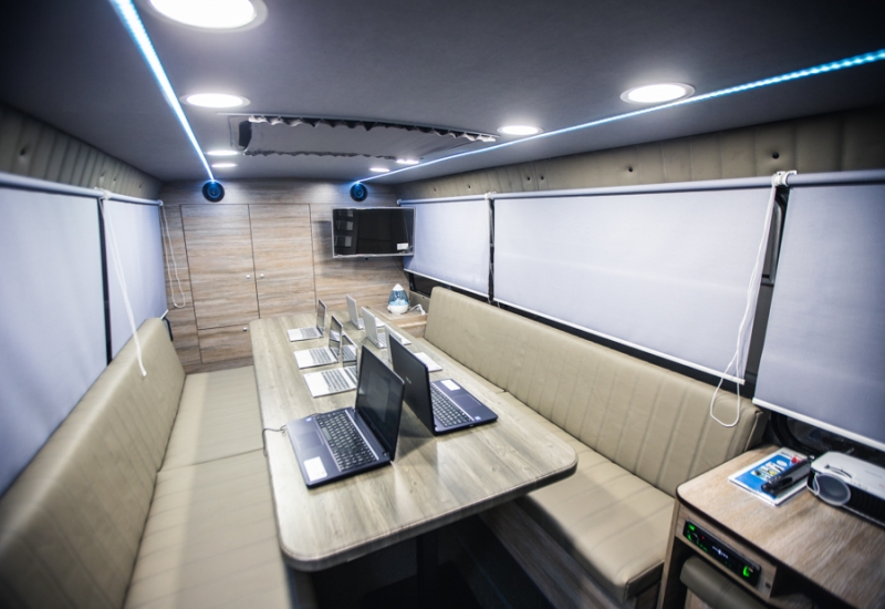 Тут є кліматичне устаткування – комбінована система опалювання, система кондиціювання та іонізації повітря, а стіни та стеля обшиті килимовим покриттям та мають додаткову шумо-теплоізоляцію. Вздовж салону розташовується робоче місце у вигляді стола та м’яких диванів, на стелі – світлодіодні кольорові лампи, а в куті знаходиться мультимедійний центр. Також, салон обладнаний шафами для зберігання майна та додаткового розгортання в польових умовах пункту психологічної допомоги, проведення практичних тренінгових занять, лекторіїв, сеансів психоемоційної саморегуляції, аутогенних тренувань, заходів з психологічного консультування та терапії. З цією метою, мобільний центр «озброєний» – дизельним генератором, мультимедійним проектором та екраном, ноутбуками та багатофункціональним лазерним друкуючим пристроєм, пересувними акустичними стереосистемами, засобами для проведення тілесно орієнтованої та арт-терапії, мотузками TRX та карематами, альпіністською системою для страховки на висоті, розкладними стільцями та столами, фліпчартом, інформаційними стендами, холодильником та термопотом тощо.