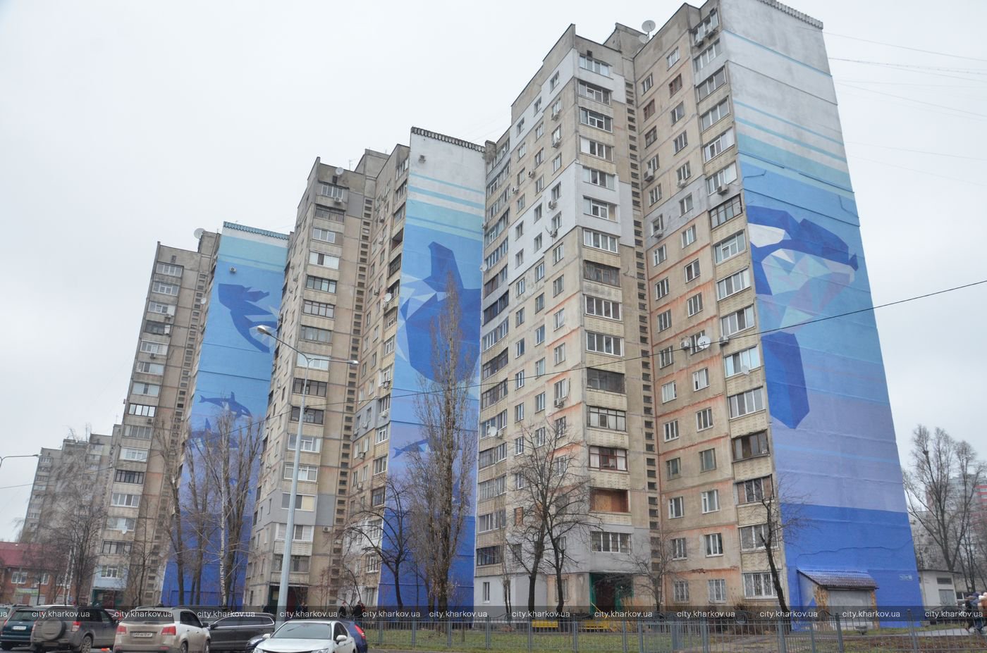 Харьковские художники нарисовали на трех стенах 16-этажного дома по пр. Людвига Свободы, 58, панно, на котором изображены пять маленьких китов и один большой (косатка).