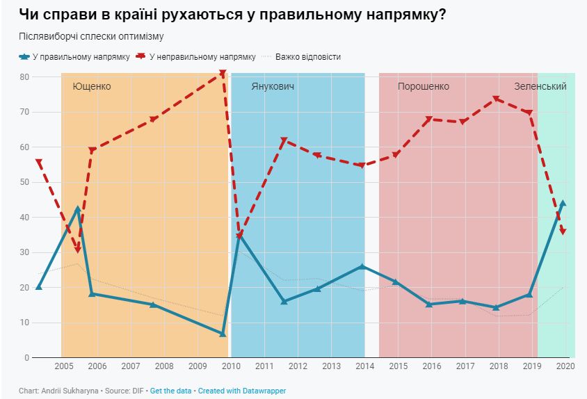 Последний раз убеждения в правильности направления Украины преобладало в общественном мнении после президентских выборов в июне 2005 года (тогда 42% считали направление движения страны правильным, 31% - неправильным), но уже в ноябре 2005 мнение граждан изменилась на противоположную: 59% считали следования страны неправильным и только 18% - правильным.