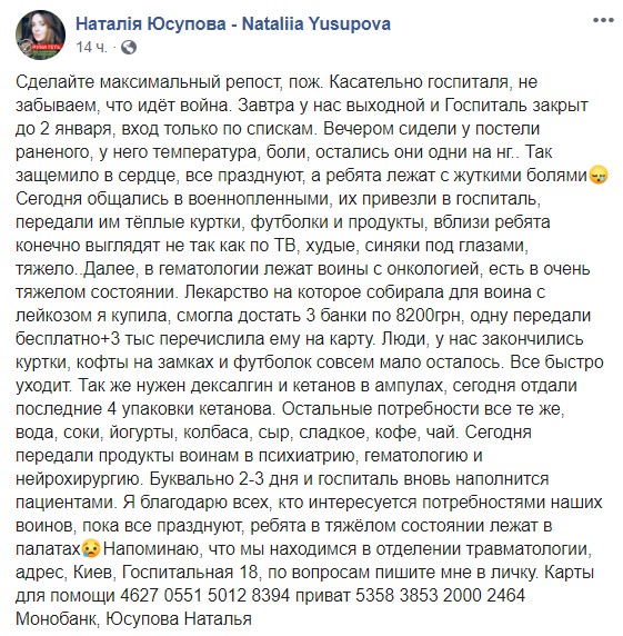 "Лекарство на которое собирала для воина с лейкозом я купила, смогла достать 3 банки по 8200грн, одну передали бесплатно+3 тыс перечислила ему на карту", - сообщила Юсупова.