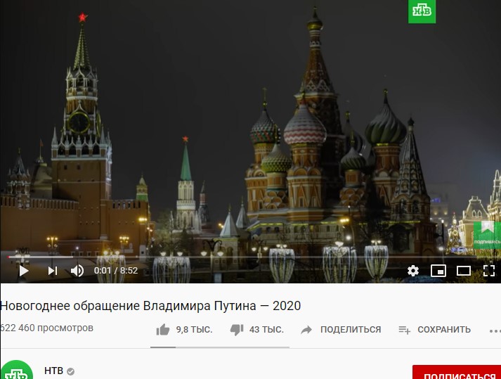Отмечается, что новогоднюю речь Путина без возможности комментировать также опубликовал телеканал НТВ. Однако под ним оставили счетчик лайков и лизлайков. Видео собрало более 600 000 просмотров, 43 000 дизлайков и всего 9800 лайков.