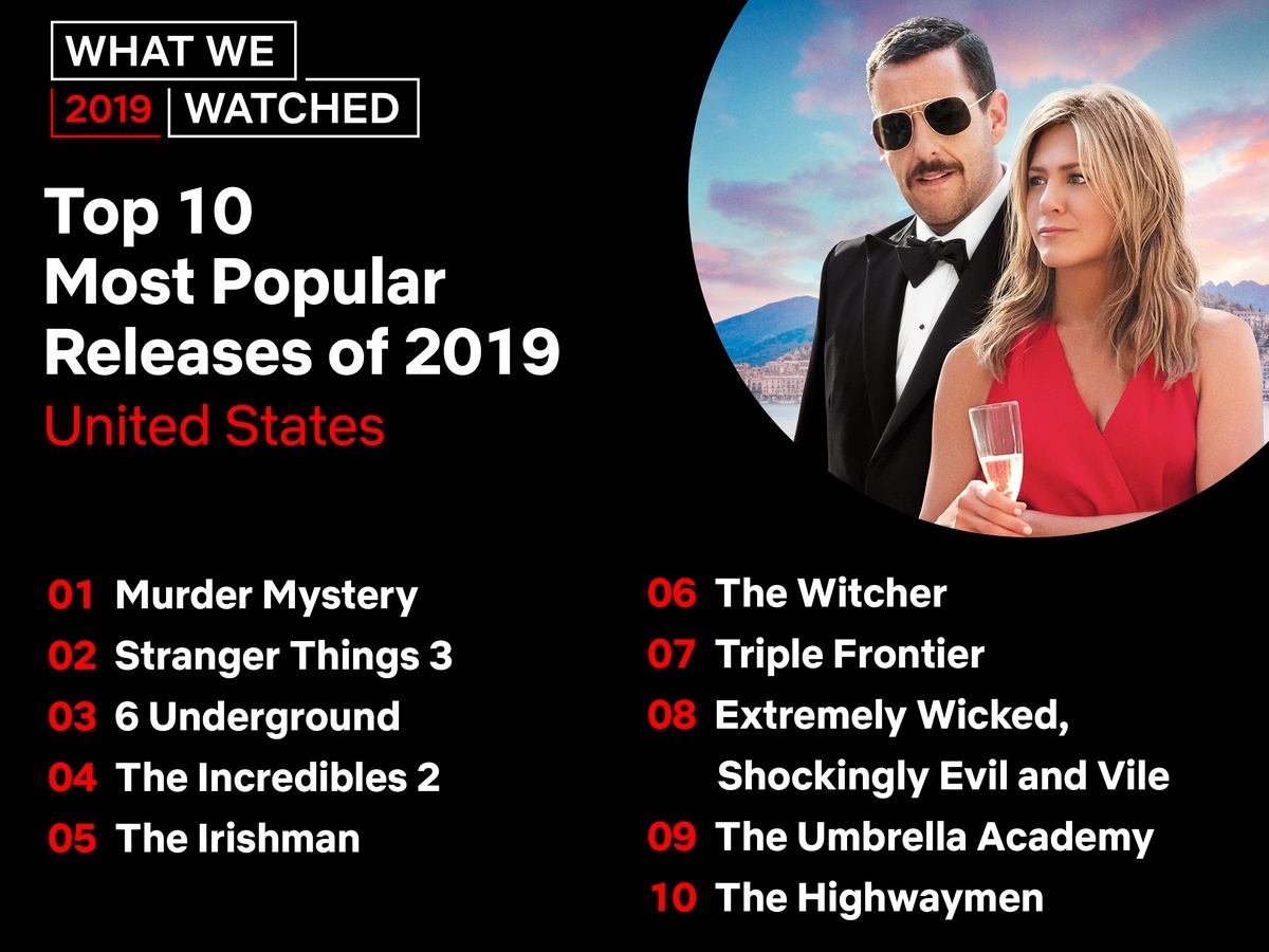 Самым популярным стал фильм "Загадочное убийство" с Адамом Сэндлером и Дженнифер Энистон в главных ролях. Комедия побила все рекорды Netflix еще летом, когда только вышла. За первые 3 дня она собрала более 30 млн просмотров.