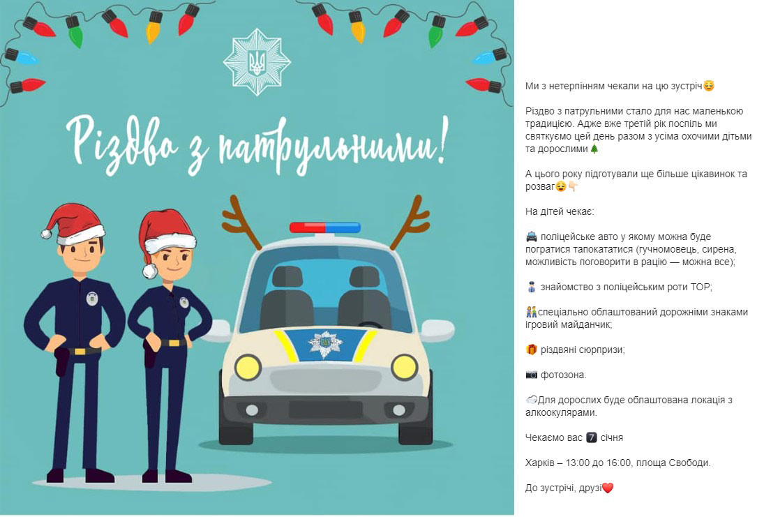 В Харькове в этом году традиционно пройдет "Рождество с патрульными". Так патрульные полицейские отметят в третий раз праздник с маленькими и взрослыми харьковчанами.
