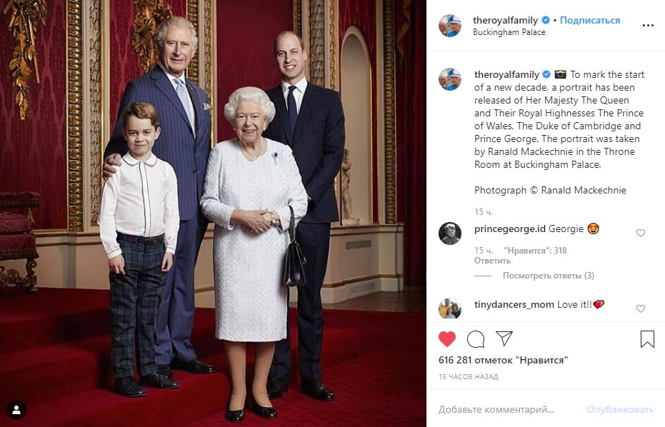 «С новым годом! Новый портрет королевы и принца Уэльского, герцога Кембриджского и принца Джорджа был выпущен в ознаменование начала нового десятилетия (здесь королевская семья ошиблась — новое десятилетие начнется лишь через год). Желаем всем нашим последователям счастливого и здорового 2020 года», – говорится в описании.