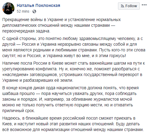 "Наличие посла России в Киеве может стать важнейшим шагом на пути к урегулированию конфликта. Ну и, конечно же, поможет разобраться с "аследием" заговорщиков"